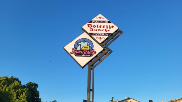 Sulle strade statali e provinciali con maggiore traffico, con impianti di varia misura e frecce direzionali pubblicitarie.